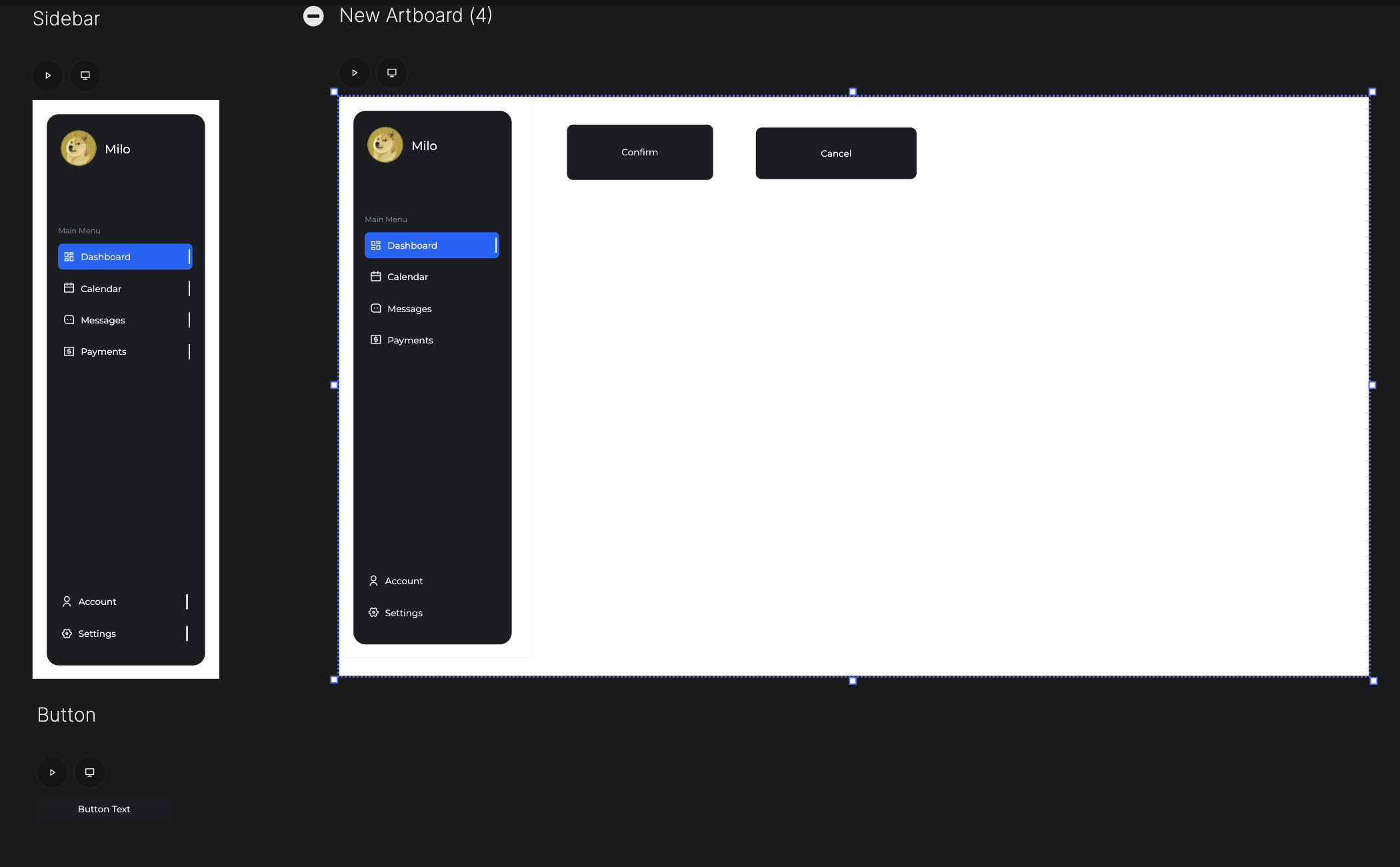 O resultado final, isto é, Artboard com a barra lateral, Artboard que é um componente de botão, e Artboard que referencia a barra lateral e possui 2 botões, está disponível em seguida, e pode ser copiado e colado no seu Builder!